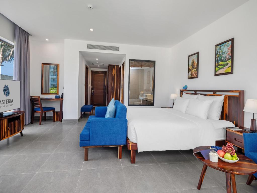 The spacious accommodations include a separate living room, allowing for relaxation and entertainment in a cozy setting. A refrigerator ensures that your refreshments are always at hand, while the thoughtfully provided toiletries add a touch of indulgence to your daily routine. With blackout curtains to guarantee a restful night's sleep, your stay at Asteria Mui Ne Resort promises to be a harmonious blend of comfort and elegance, making it the ideal retreat for travelers seeking tranquility and luxury in Phan Thiet, Vietnam.