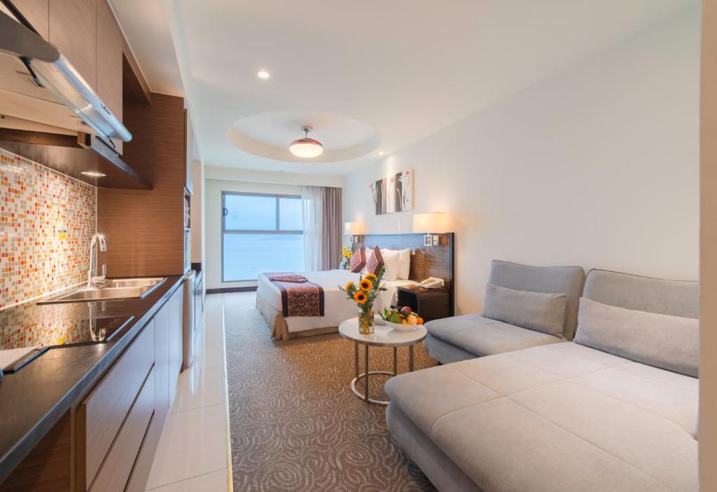 From the early morning of December 9th to the evening of the 11th, I stayed with a total of four people including my in-laws and husband in two deluxe sea view rooms. My father-in-law had previously visited here in March for a family gathering and was satisfied, so he recommended this place for our family trip. The location is great, with the Pink Tower (White Tower) visible from the pool. Within a 10-minute walk from the hotel, there’s Lotte Mart Gold Coast, Chon Chon Kim, and Pizza 4 Piece. Right next to it is Costa Seafood. To the left of the hotel, within 10 minutes, you can find the Pink Tower, night market, and Vincom Plaza 2. Everything seems to be about a 25-minute walk away. The Dam Market is a 20-minute walk. There is a private beach access in the basement, but it rained throughout our stay so we couldn't go. My father-in-law who visited in March mentioned there were private sunbeds on the beach, which were nice. The pool is on the 5th floor, with a sauna that has both dry and wet options, along with lockers, and there are also fitness and massage shops. The breakfast restaurant on the 3rd floor requires a keycard to enter, and the breakfast is quite similar every day with limited options, but since there are many Korean guests, there are a few types of kimchi and seaweed soup. There are many Chinese guests too, so it seems there are food options for them as well. The elevators are quite fast, but only the fastest of the six lights up, which can be frustrating at first. The basic deluxe room is 40m2 and larger than the basic rooms of the nearby InterContinental and Sheraton, based on my Agoda search. There’s one socket next to the bed, but two around the vanity and one for USB. The hygiene is good and the large space allows for separate areas to unpack luggage. All the staff are friendly, especially the cleaning staff who are very kind. If I had to mention a downside, the pool depth is said to be 1.4m, and as someone who is quite short, when my feet touch the bottom, the water is up to my chin, so I had to tiptoe holding onto the wall. It would have been better if it were about 10cm shallower. The water is cold, but on a hot day over 33 degrees, it would be perfect for a long stay. When I went, it rained heavily, and since it wasn't hot, it felt cold after a while. Also, the wall next to the bathtub in the bathroom is beside the bed and glass, with beige blinds. Even though I was with my husband, a slight silhouette was visible when using the bathroom, which made me feel a bit embarrassed. It would be better if the blinds were a darker color. Other than these two points, I was very satisfied, and I plan to stay here again and recommend it to others. I wrote a lot, but it means that I have a 100% willingness to revisit. Oh, I encountered one team of Chinese guests on my floor, and it felt nice that the hotel seemed to separate Chinese and Korean guests by floors. The Sky Light Bar above was quiet, possibly because there were no guests since it was raining, and the construction next to the hotel seemed to have paused, making it quiet too.