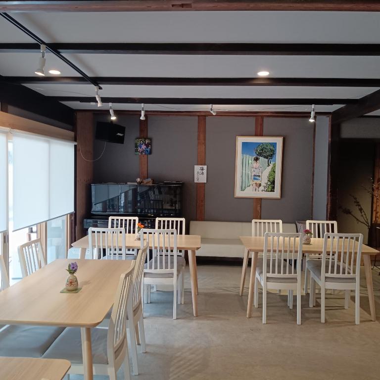 At Kiyotaki Ryokan, guests can enjoy a variety of entertainment facilities, including a spacious shared lounge and TV area. Whether you're looking to unwind after a long day of exploring Hikone or connect with fellow travelers, this inviting space is the perfect spot. Sink into comfortable seating as you catch up on your favorite shows or movies on the large flat-screen TV. The lounge area is tastefully decorated with traditional Japanese elements, creating a cozy and welcoming atmosphere. It's an ideal place to relax, socialize, or simply enjoy some downtime during your stay at Kiyotaki Ryokan.